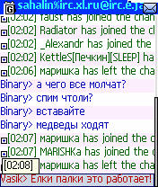 - И, наконец, чтобы войти на канал, нужно: в главном меню выбрать пункт Conference (Конференции), в поле Room заполнить имя_канала%IRC_сервер, например, sahalin%irc.xl.ru, в поле Host ввести имя Вашего IRC-транспорта, например, irc.e.jabber.ru, выбрать Join в меню. Если все прошло удачно, в списке контактов Вы увидите новую группу, носящую название канала и IRC-сервера: