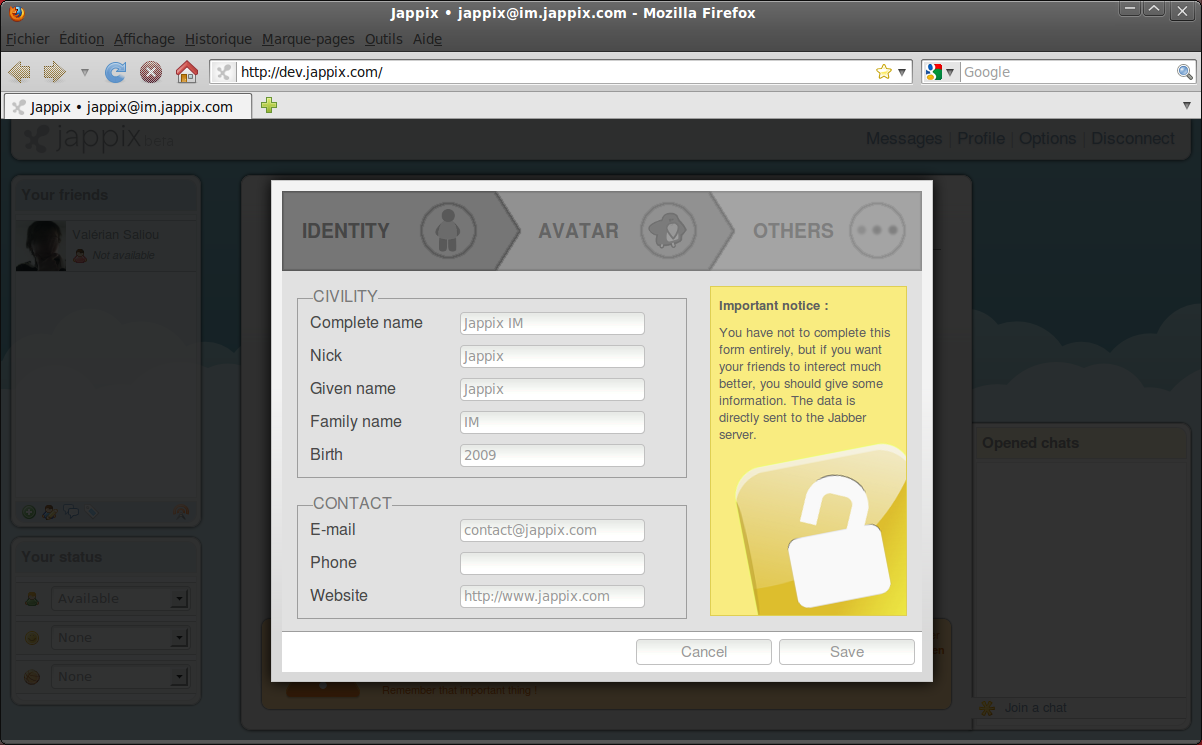 | current | 11:19, 1 May 2010 | 1,202 × 745 (120 KB) | Cblp.su (Talk | contribs) | Jappix screenshot |