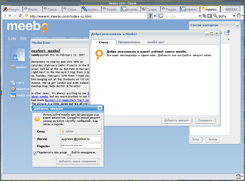 Теперь вводим данные для джаббер авторизации. Если мы захотим использовать больше сетей обмена сообщениями, то все контакты предстанут в одном списке.