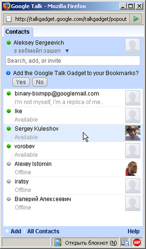 Вместо отдельной вкладки клиент может быть постоянно открыт в боковой панели (sidebar) браузера Firefox. Чтобы добиться этого создайте закладку на ссылку "http://talkgadget.google.com/talkgadget/client", затем перейдите в свойства этой закладки, где взведите флажок "Load this bookmark in the sidebar". После этого включите отображение боковой панели. Похожим способом расположения внутри окна Firefox отличаются некоторые другие IM-решения, например, xmpp4moz.