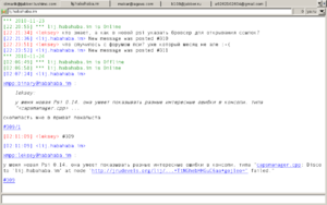 - ↑ В качестве указателя на опредленное сообщение, наряду с решеткой и номером, можно пользоваться xmpp-ссылкой. Например, вместо #1 написать xmpp:leksey@habahaba.im?;node=urn%3Axmpp%3Amicroblog%3A0;item=5194455A47652 (пока это не работает и сервис только резолвит отправленные ему ссылки в обычные номера с решеткой).