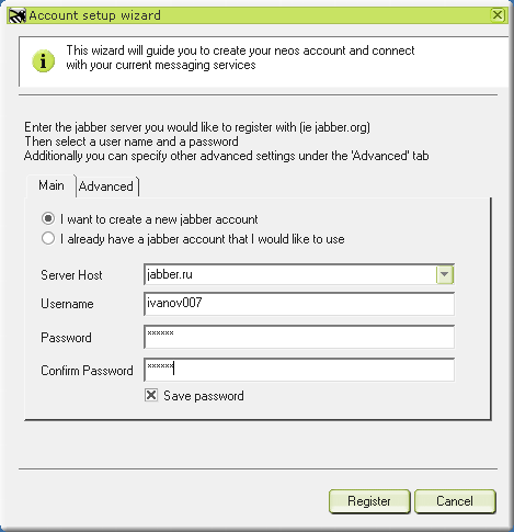 В списке серверов есть куча русских. Выбираем, предположим, основной русский сервер — jabber.ru, затем вводим свое имя и пароль. Выбор имени важный момент — такой же как выбор имени почтового ящика. Тем более идентификатор жаббера (JID) выглядит также как адрес почтового ящика — имя@сервер.