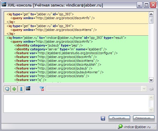 | 20:25, 16 April 2009 | XML console.JPG (file) | 84 KB | XML консоль из QIP Infium, как пример XML консоли. Содержимое консоли: вид изнутри на Service Discovery. Оранжевым выделены отправленные стансы, зеленым - пр | 1 |